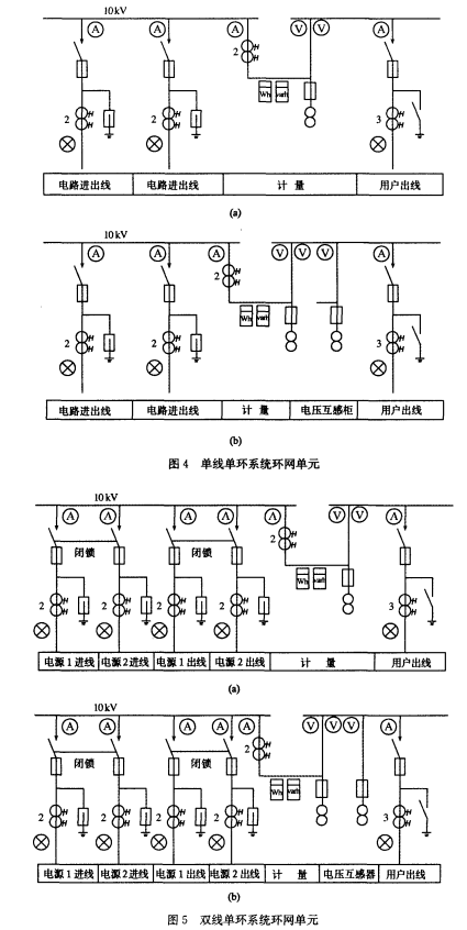 环式配电系统中的用电单位配电系统接线(环网单元)的电源进出线柜不设维护设备,见图4~6.放射式或树干式配电系统的用电单位终端配电所,进出柜应设维护设备。