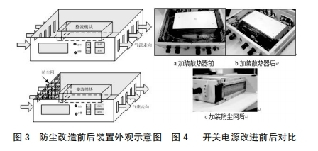 3.2在设备本体进风孔加防尘网,避免尘土进入设备内部,设备维护人员定时对滤网间断清扫,然后减轻元器件外表覆尘,利于设备正常散热,如图3所示加装防尘网后开关电源标明图。对设备施行上述改善后,其改善前后对比如图4所示。