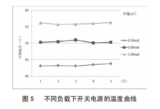 改善后,为考证改善作用,对开关电源分别在0.5倍、0.8倍及1.0倍负载下间断了为期5天的带负荷实验,图5为不同负载下开关电源的温度曲线,由图5可知,跟着负荷的增大,开关电源问题整体呈上升趋向;负载不变的情况下,同一温度曲线根柢坚持滑润;开关电源在额定负载下作业,最高温度不超越57℃,未达报警值,开关电源稳定性得到明显前进。