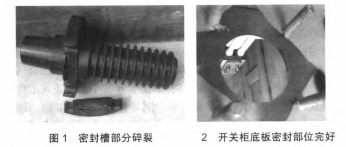 如图1所示,穿墙套管密封槽部分碎裂发生气体泄漏,与穿墙套管协作部分的密封面润滑无缺点??毓褚豢荚谏璞赋龀Ш笪蘼┢窒?,作业一段时间,断路器开关分合操作几回后呈现气体泄漏。现咱们针对穿墙套管联接结构进行剖析。