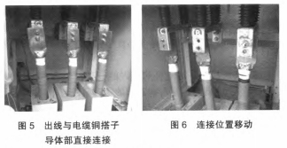 穿墙套管下部为出线,与电缆铜搭子导体部直接联接,如图5所示。撤消联接螺栓后发生联接方位移动,如图6所示。此现象说明电缆铜搭子与穿墙套管存在很大的联接变形,并发生应力,在电缆通电后发生的电动力和联接应力进一步作用于穿墙套管,使得穿墙套管发生碎裂。