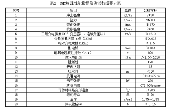 2.3.1分支箱外壳选用S304不锈钢材料,箱体、门体材料厚度均不该小于2毫米,或SMC复合材料箱体,SMC物理功用方针及测试数据满意表2的要求。