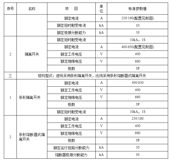 2.2.1低压电缆分支箱选用元件??樽樽啊⒔峁棺樽敖峁?,母线及馈出均绝缘关闭。可选用五种结构型式:进线选用绝缘关闭的隔绝开关,出线选用塑壳断路器;进线选用绝缘关闭的隔绝开关,出线选用刀熔开关;进线选用条形隔绝开关,出线选用条形开关(带熔断器保护);进线不带开关,出线选用刀熔开关;进出线均不配备开关。