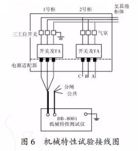拆下充气柜实验接口的插拔式堵头,将电流适配器刺进实验接口,将三工位阻隔开关置于接地方位,从电流适配器处取信号,操控电压加至二次端子分、合闸及公共端子处。实验接线如图6所示。